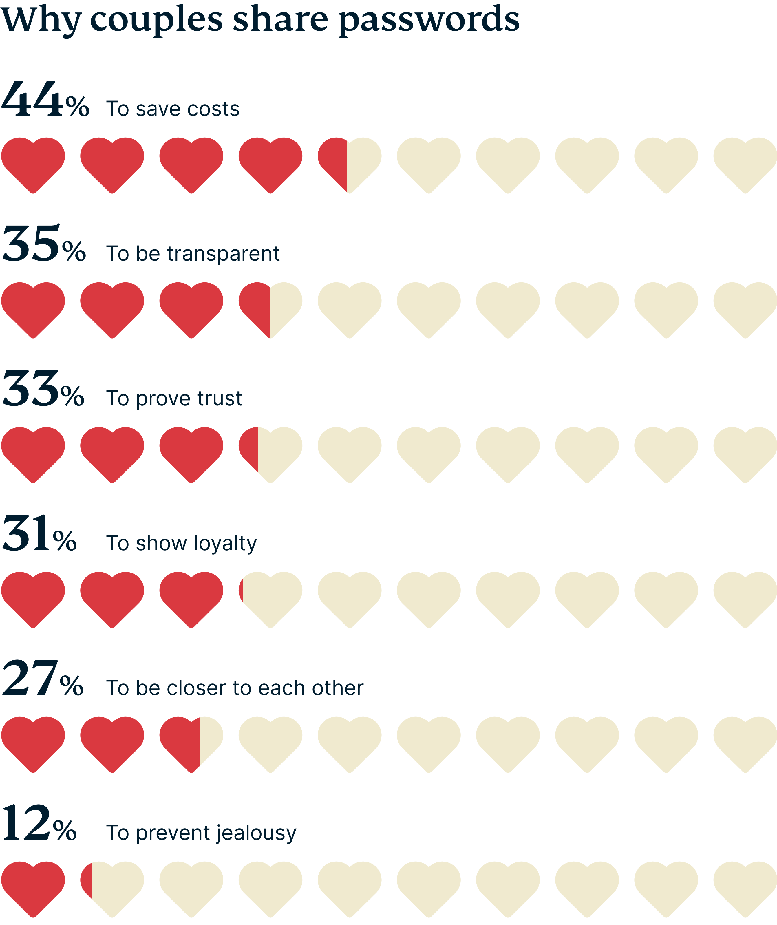 The reasons for this vary, but the most common one is pragmatic—to save money. Other reasons involve improving the relationship, such as displaying transparency or trust. Perhaps most worrying, 12% have even shared passwords to prevent jealousy.