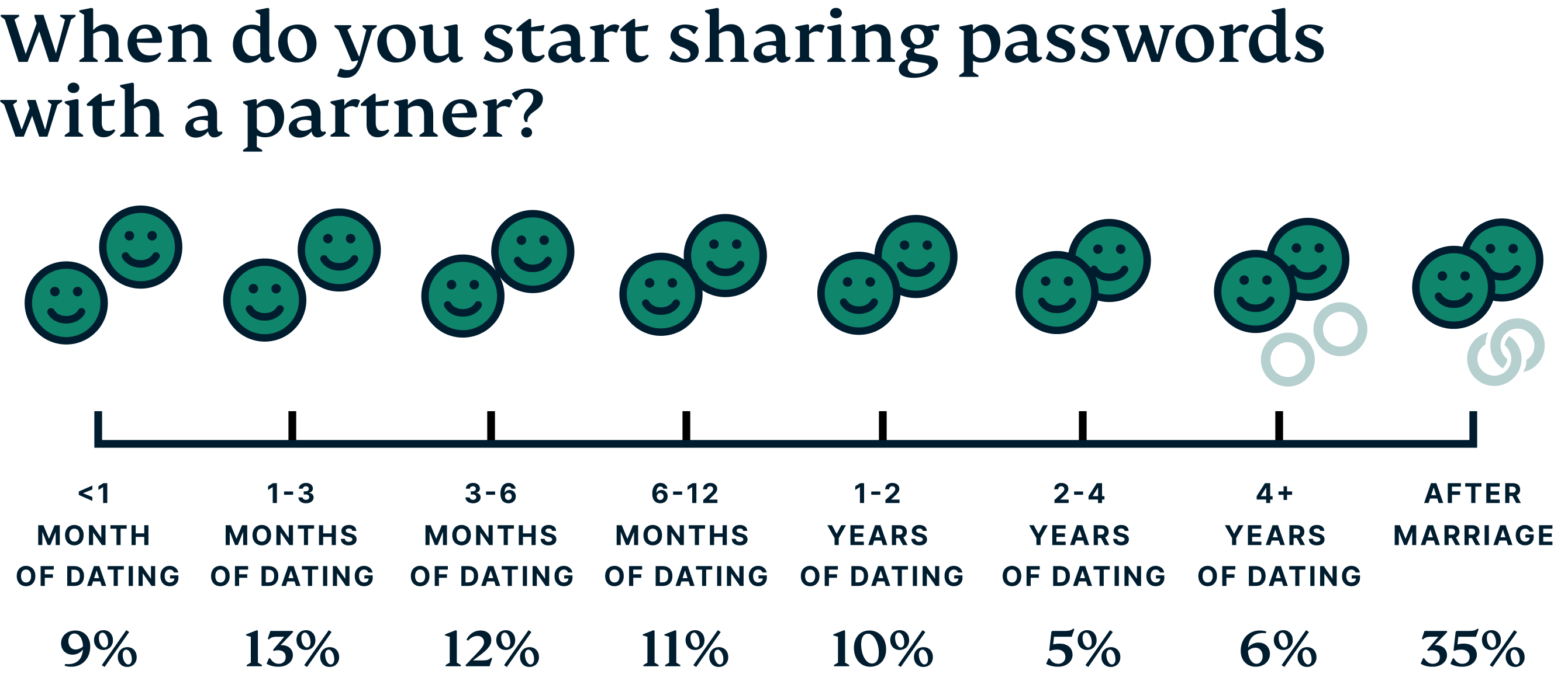 Every couple progresses their relationship at a different speed, and the same can be said for password sharing. While 35% of couples wait until marriage before swapping passwords, a good number of respondents do so much earlier, with 9% even sharing within the first month of dating.